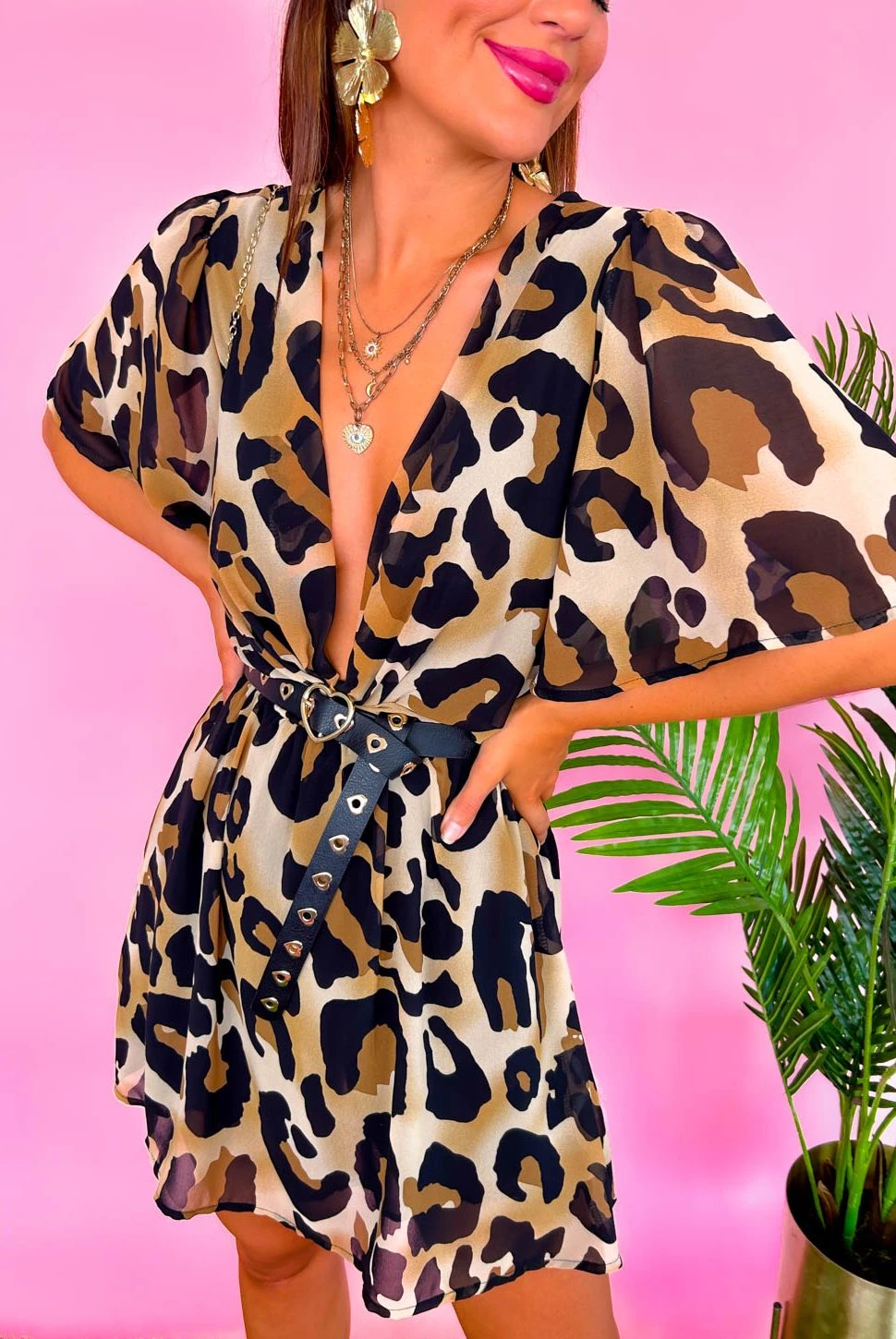 Us and this dress? It was love at first sight! Fall head over heels for this swoon-worthy mini dress. In all-over fierce leopard print, it features floaty short bell sleeves and a matching printed buckle belt with belt loops. Now that’s amore, Doll! Spice things by plunging the V-neckline and adding neon heels, or keep it cool on scorching days in sunnies and chunky sandals.