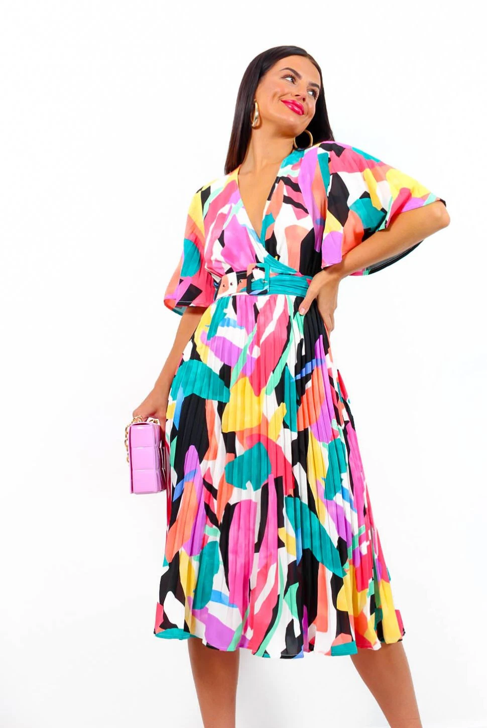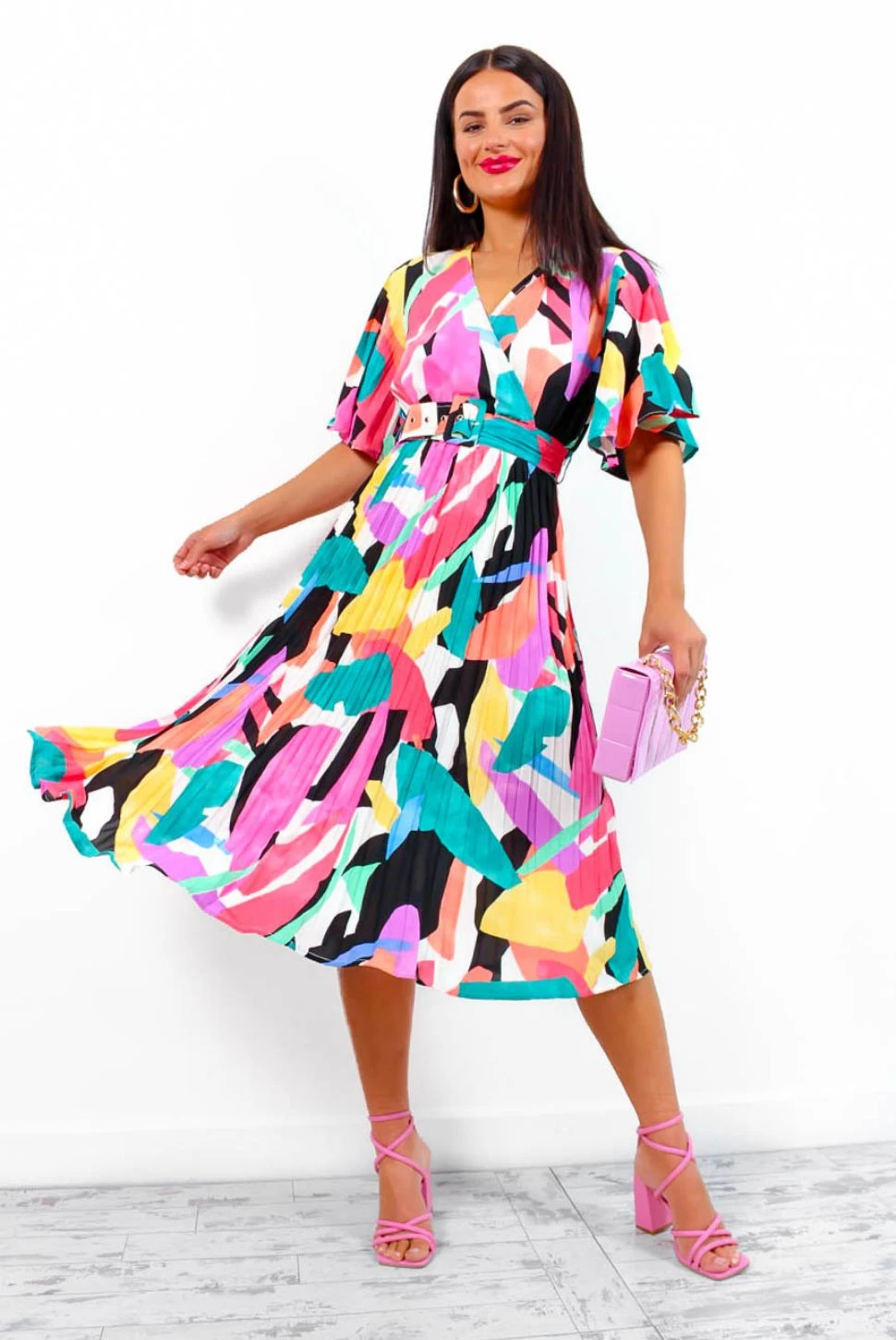 Colour blocking my way through life! This midi dress features a mix of pink, green and yellow abstract print throughout, pleated angel sleeves with a pleated bottom skirt, cross-over neckline, and a removable belt to finish it off! Add green heels and gold jewellery for special occasions.