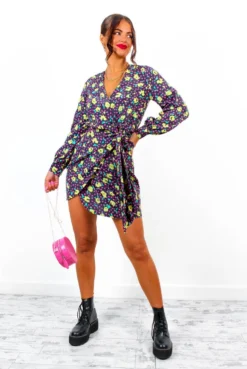 Glamorous No Second Chances – Black Multi Rose Mini Wrap Dress