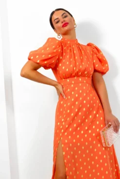 Got The Flower – Orange Gold Foil Midi Dress