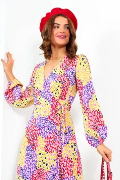 Caught Your Attention – Magenta Blue Leopard Midi Wrap Dress
