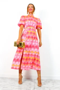 If I Were You – Pink Orange Shell Print Puff Sleeve Midi Dress