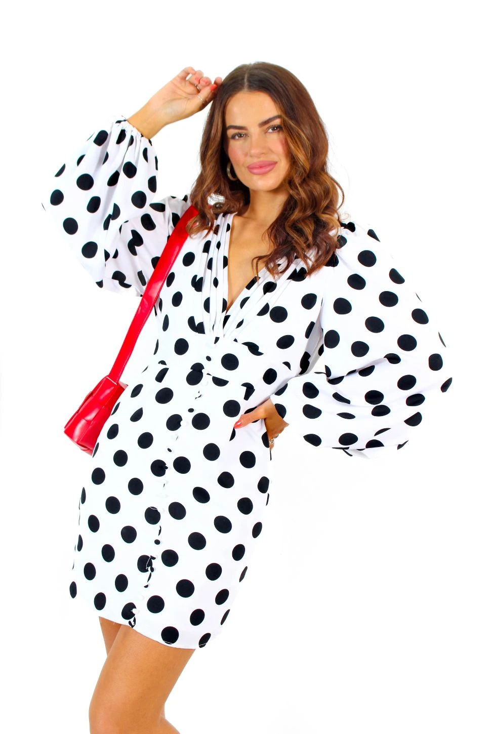 Be your own muse, Doll, you’re a work of art! Enter the monochrome zone in sassy Spring style in this bold black and white polka dot mini dress. In this season’s trending oversized spot print, complete with billowy volume sleeves, deep V plunge neckline and faux button placket, you’ll be spotted and swooned over at your next Spring fling! Whether it’s a mid-morning bottomless brunch with the Dolls, or a dinner date that leads to the dancefloor, just add colour pop accessories for maximum WOW!