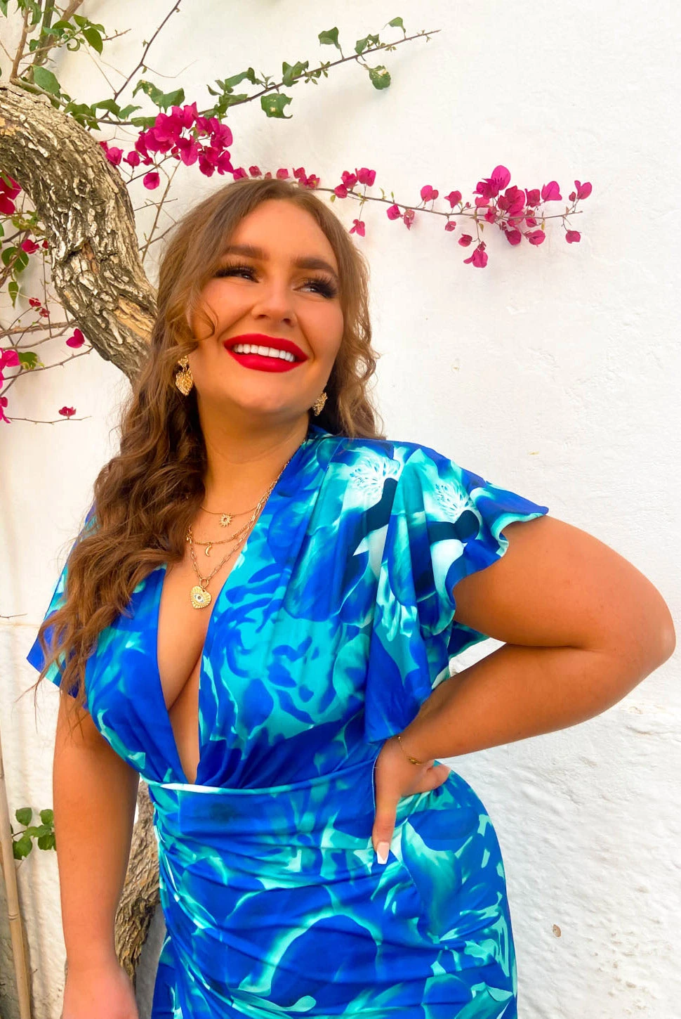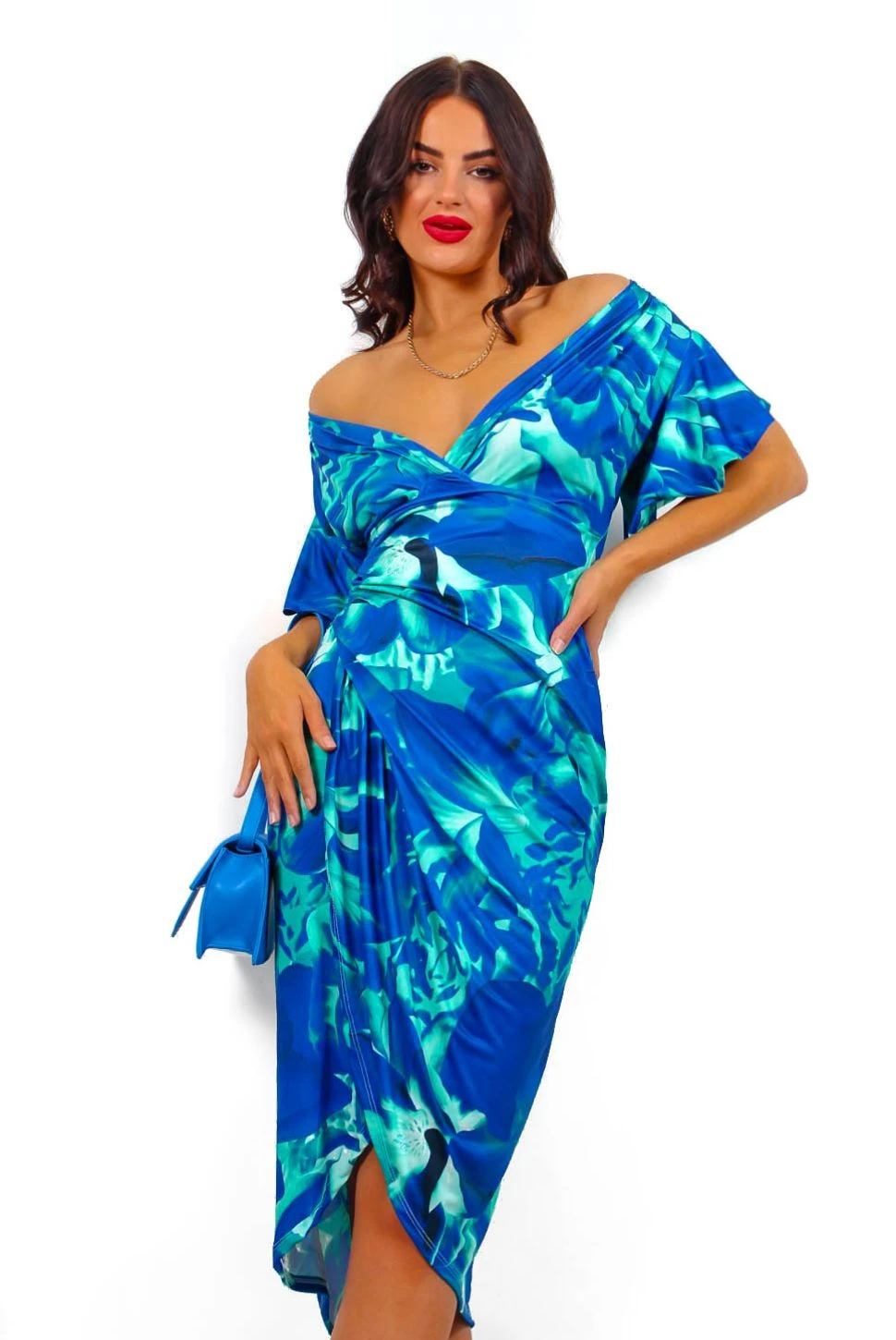 She’s badder in blue. Figure hugging to create a stunning silhouette, this bodycon midi is finished with an abstract blue and green print throughout. With dreamy flowy angel sleeves, a plunging neckline and a flattering drape detail that creates a sassy leg split, it’s the epitome of elegance! Strut to the bar in contrasting fuchsia accessories and prepare to have all eyes on you.