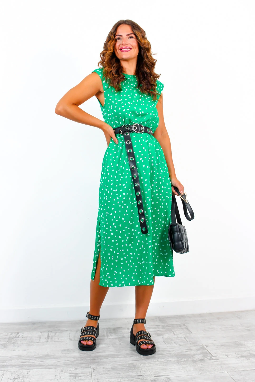 Spotting you in a crowd? That’s easy, baby! Look fierce at your next get-together in this stunning polka dot print midi dress. Featuring a green base with white spots, this sleeveless stunner features subtle shoulder pads, a removable fabric waist tie and two side leg splits for added flirty flair. Team with strappy black sandals and a slick of red lipstick for a look to drive the bar wild!