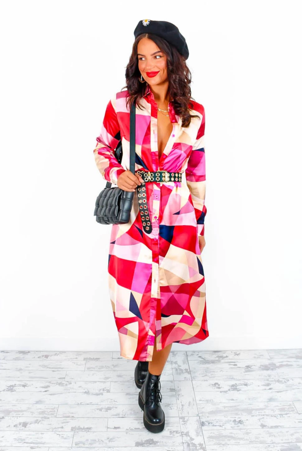 Girl, you look sensational! In a midi length, this chic shirt dress comes in shades of pink abstract print throughout, long cuffed sleeves, button-down fastening, and a matching removable fabric belt to accentuate that waistline. Strut your stuff in matching pink heels and clutch bag.