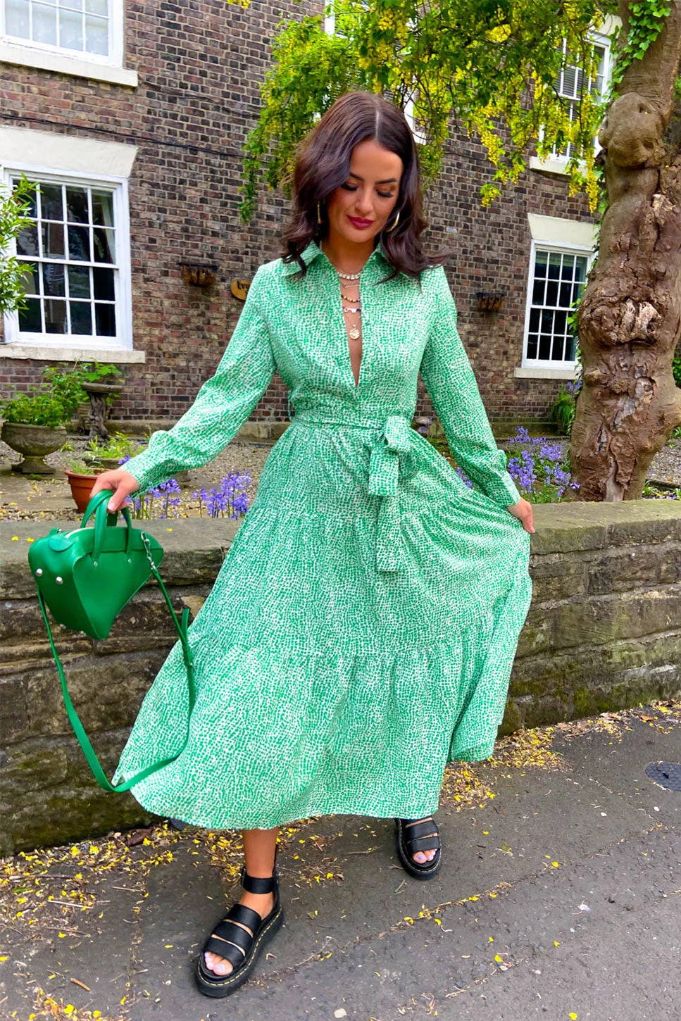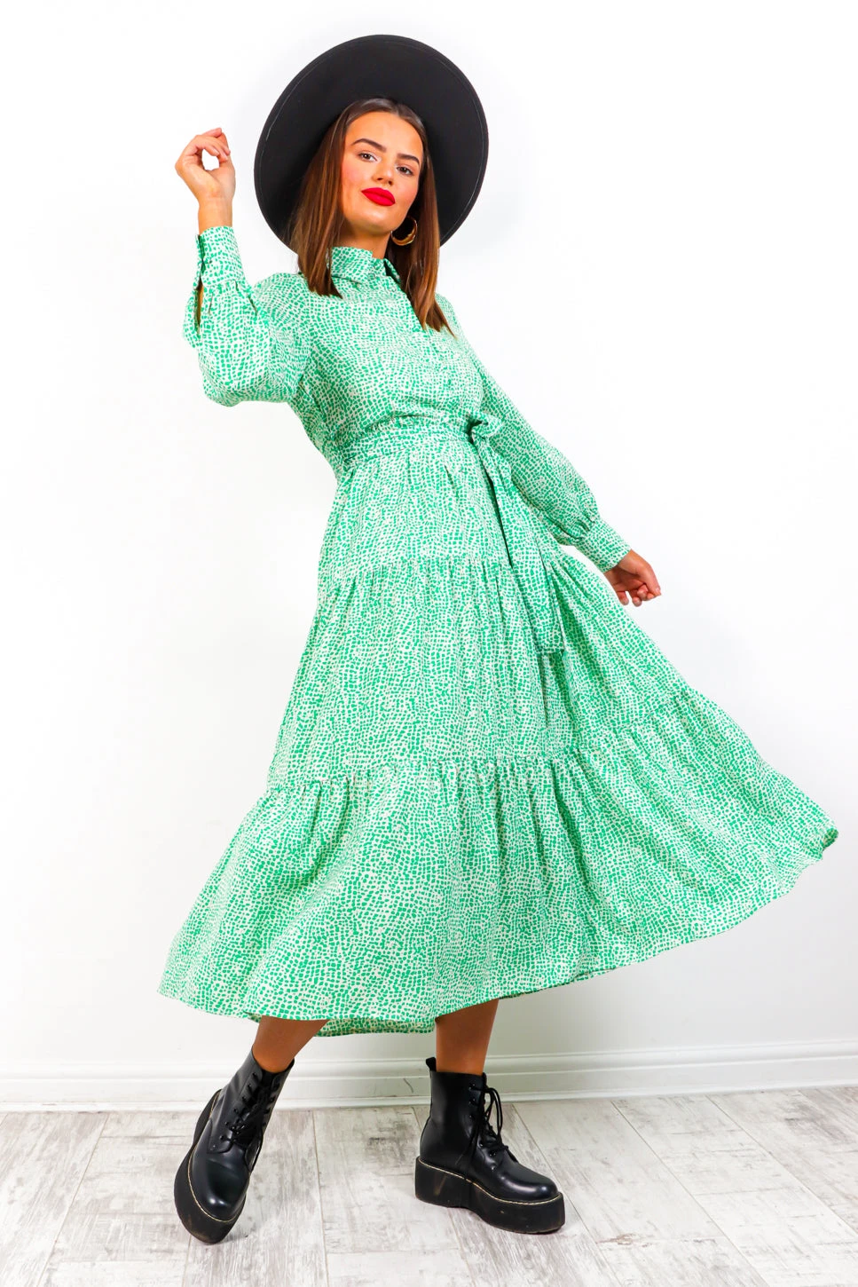 This smock dress is top tier in our books! Featuring a multi-tier detail on green and white spotted fabric, this dress is perfect for smart-casual vibes. With long cuffed sleeves and a collar, this dress also features a tie-belt detail to cinch in the waistline for a flattering fit. Team with black boots and a leather jacket to toughen up your ensemble.