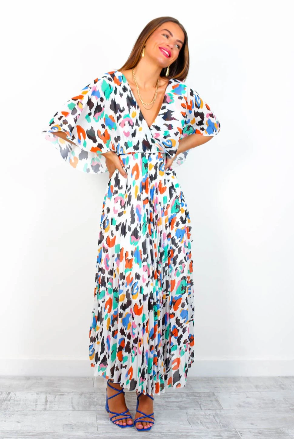 In a world of trends, be timeless, Doll! With a statement cut-out back and floaty angel wing sleeves, this Doll-favourite backless midi-maxi dress rocks showstopping pleats in all-over multicolour leopard print for a wild and whimsical twist. Rise to the top of the best dressed list at sunny summer weddings and bff brunches, paired with colour pop heels and a bold red lip.