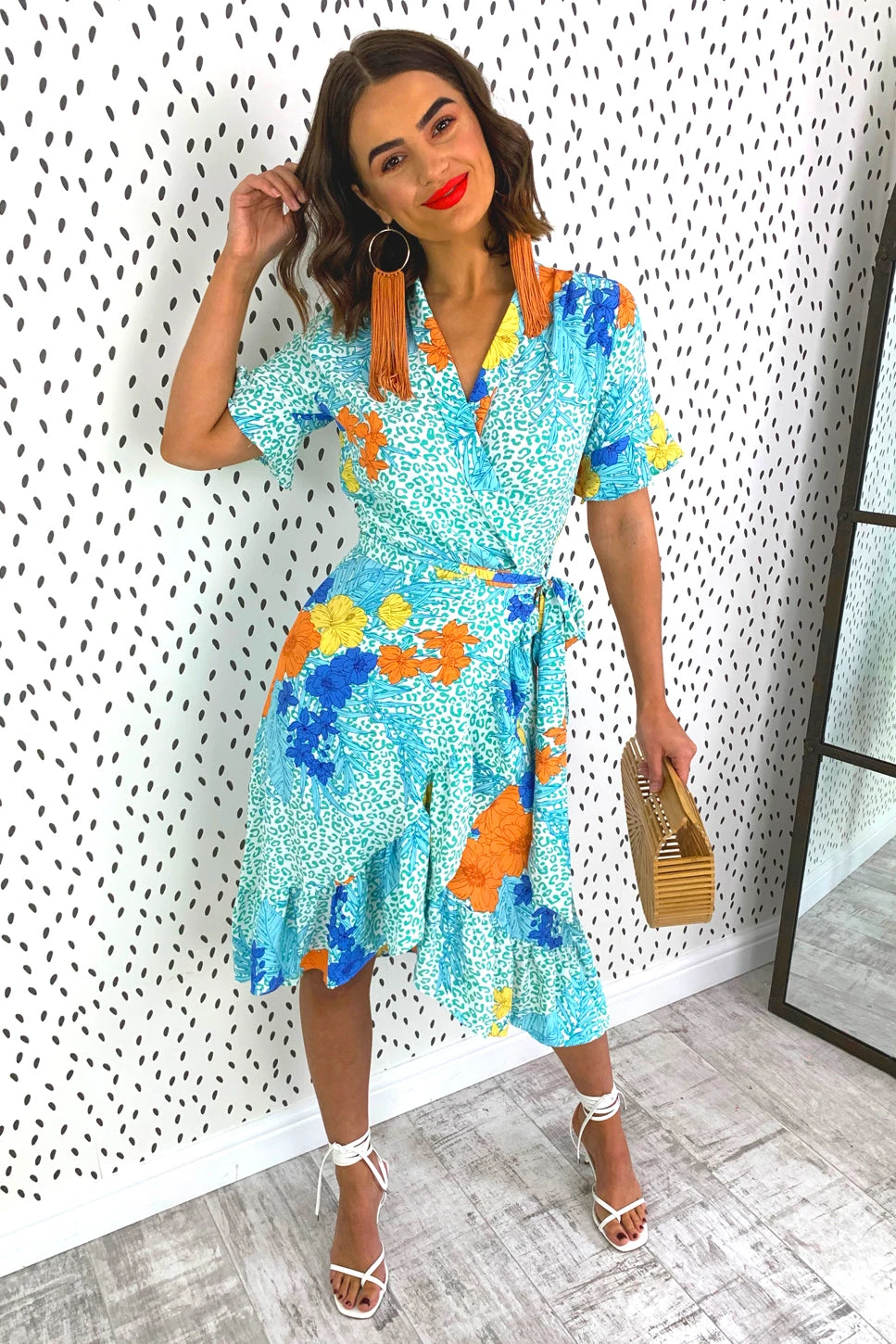 You don’t need to be off to the tropics to look good doll. This midi dress features a turquoise floral print with pops of orange, yellow and cobalt throughout, short sleeves, a tie waist with wrap fastening and a frilled hem. Pair with orange heels for a bright and stylish look that’ll get you noticed.