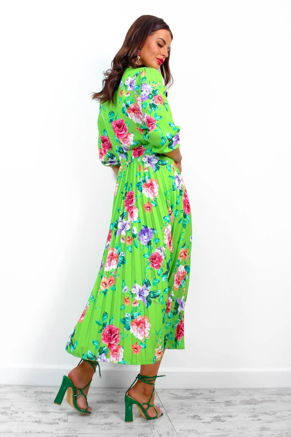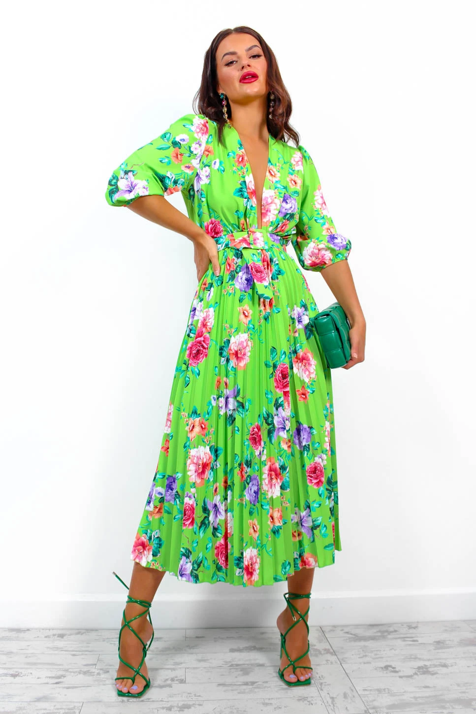 We blooming LOVE this dress!Ā Blossoming in stunning florals throughout, this green midiĀ has a flowing pleated skirt perfect for swishing across the dancefloor at the evening do, and a matching material belt to shape and cinch the waist, creating a figure flattering silhouette. Take this from day to night in serious style withĀ matching greenĀ accessories.Ā