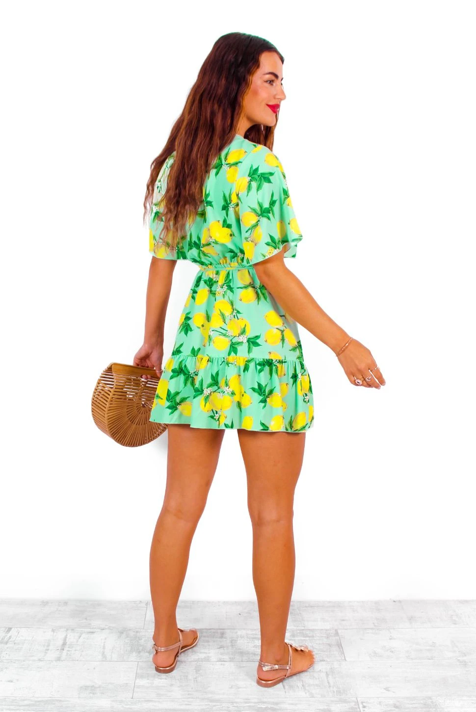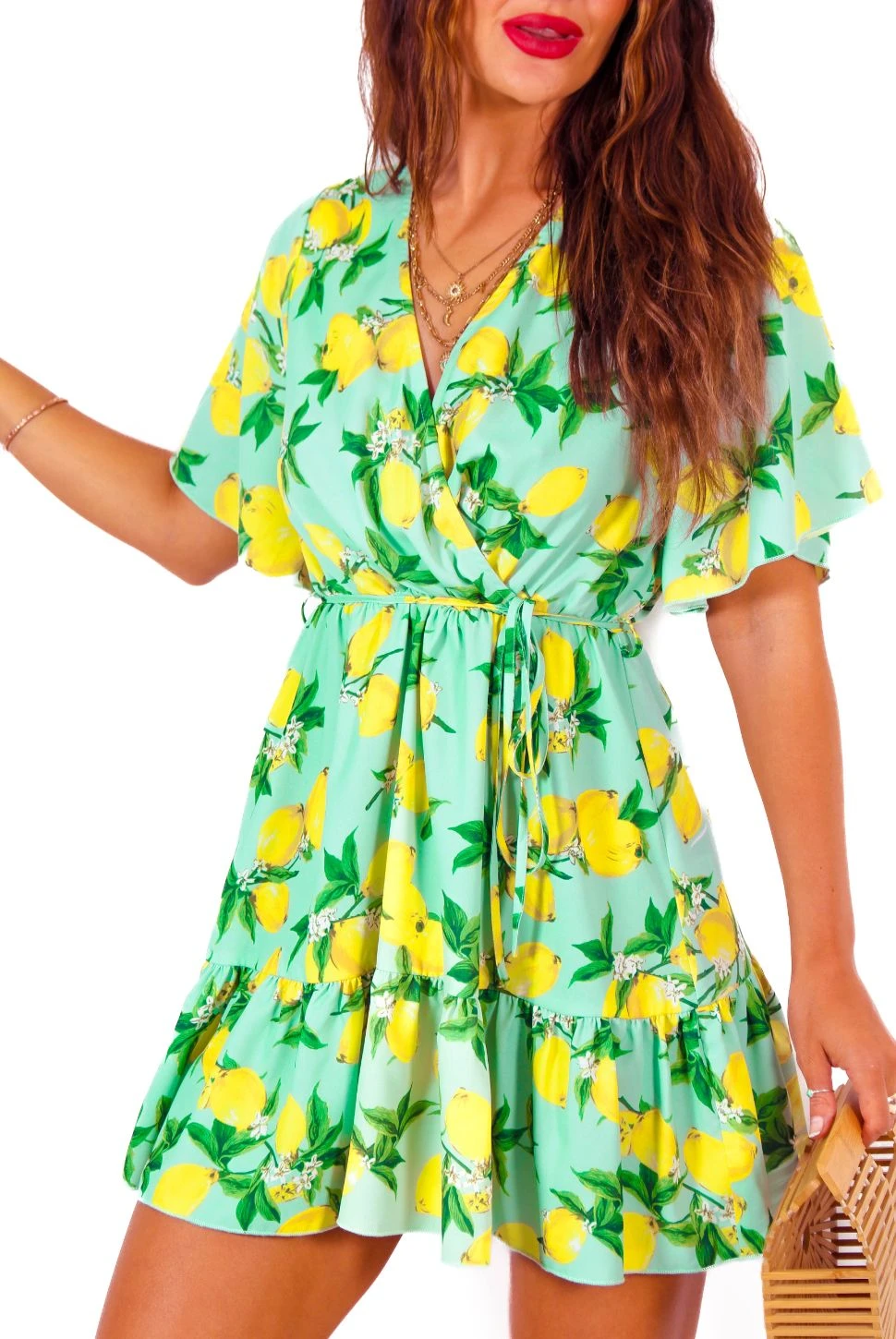 When life gives you lemons… make a lemon cocktail! Get your holiday rotation ready for take-off in this stunning lemon print mini dress. This sassy tiered hem mini is the answer to your Mediterranean dressing dreams – with a cool green and zesty lemon print, a matching material belt to cinch the waist and a crossover neckline. You look like a total hottie, Doll! Layer up on the gold jewellery and slip on a pair of gold platform mules for a holiday look that can take you from day time soirees to evening dinner and drinks.