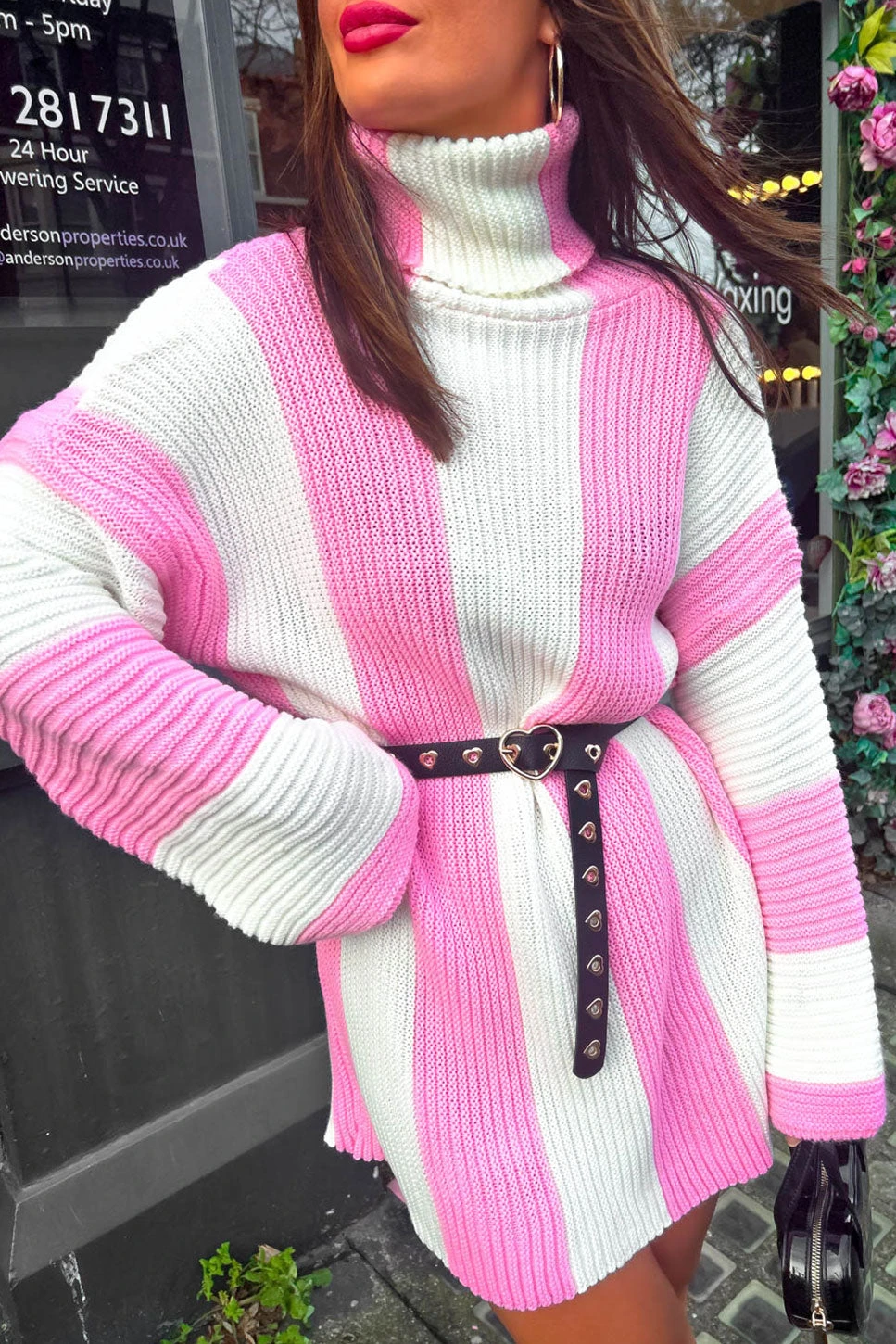 Blow them away with this super sweet bubble-gum pink and white stripy jumper dress. A fun and fabulous roll neck knitted dress feat. slouchy sleeves and longline fit, perfect for cinching at the waist with an added belt. Keep the pink popping with a matching candy-coloured boot and bag combo for casual-but-chic vibes.