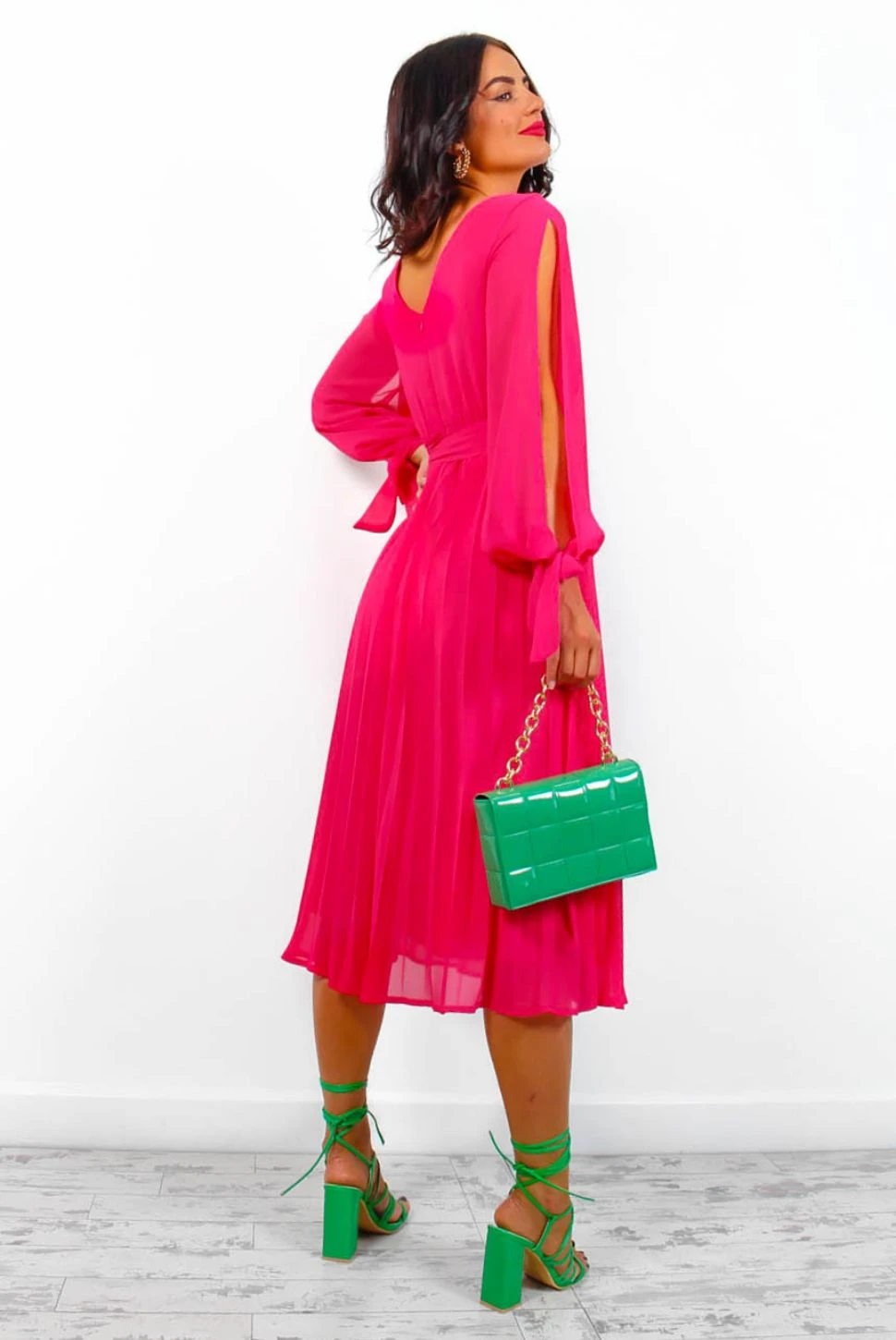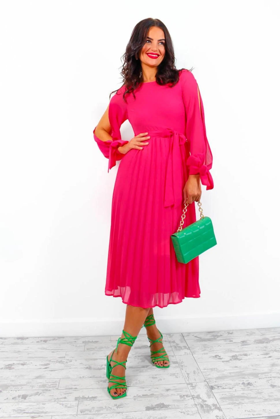 This dress is always on our minds. This midi dress comes in a bright fuchsia, round neck, long sleeve with tied cuffs, a pleated skirt, peekaboo shoulder slits and a removable belt. Ready to make everyone wink this occasion season, add gold heels and accessories for the wow factor.